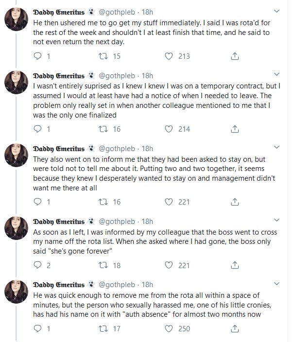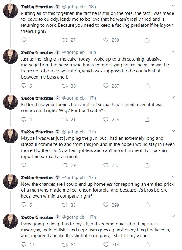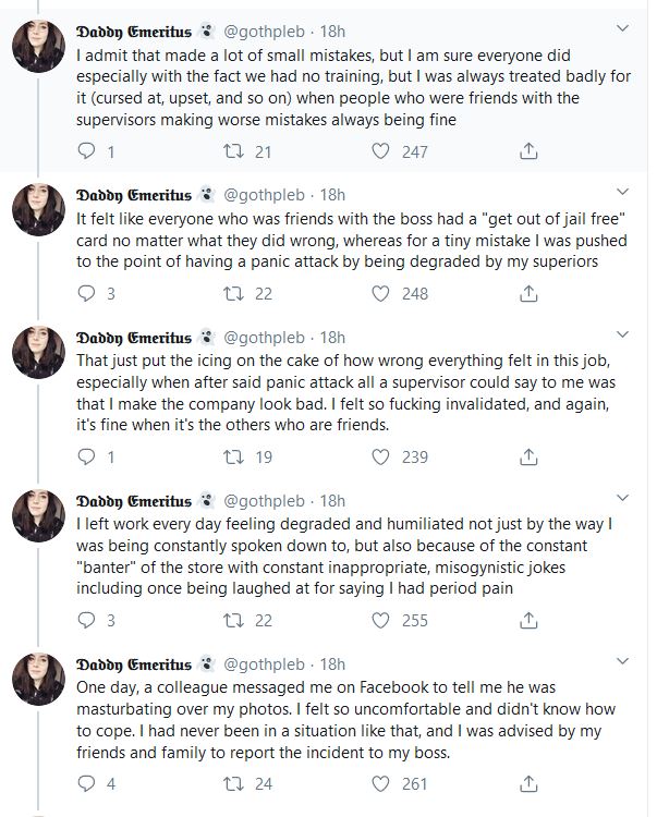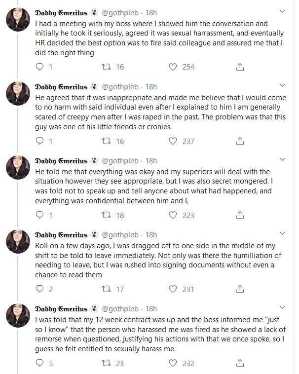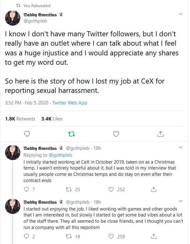 Twitter user @gothepleb has detailed an account of where she says she was sexually harassed by a colleague when working for the high street retailer CeX.